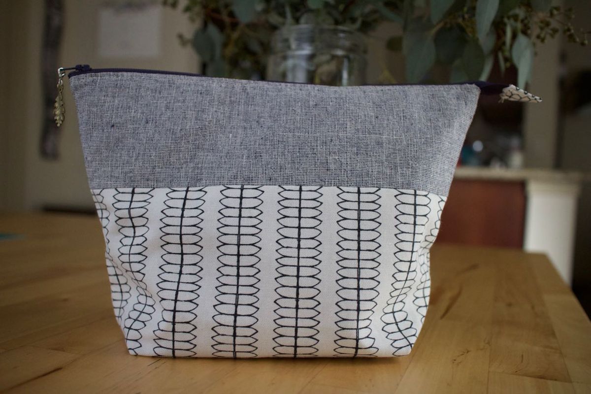 A zippered pouch/project bag: Done! I stayed up far too late working on it (whoops) but I was too excited. Using this tutorial by Noodlehead, I made a large sized pouch and learned several new skills, including boxed corners, use of interface and lining, and zipper installation for a bag. The top fabric is leftover from the quilt backing(!) and the canvas bottom was something I picked up from JoAnn's awhile back.